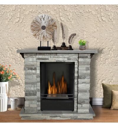 Camino a bioetanolo rifinito effetto pietra, bruciatore da 1,5 lt. Potenza 2,5 Kw, ideale per 25 mq. Il camino è