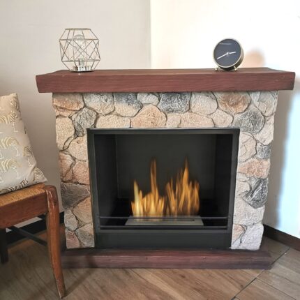Camino a bioetanolo rifinito con effetto pietra ed effetto legno per top e base. Il camino è composto da un