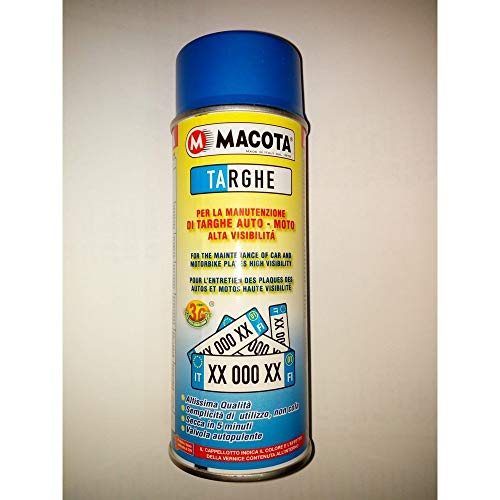 Macota Targhe 3G per la manutenzione di targhe di auto, moto e caravan. Vernice spray caratterizzata da un'alta visibilita'. Contiene un basso contenuto di COV Una bomboletta puo' coprire una superficie di circa 1,5 – 2,0 med e' consigliabile applicarla su fondi chiari. Asciuga in 5 minuti. Bomboletta da 400ml.